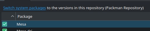 6. Clique no link “Switch system packages” to the versions in this repository (Packman repository) no topo da tela.