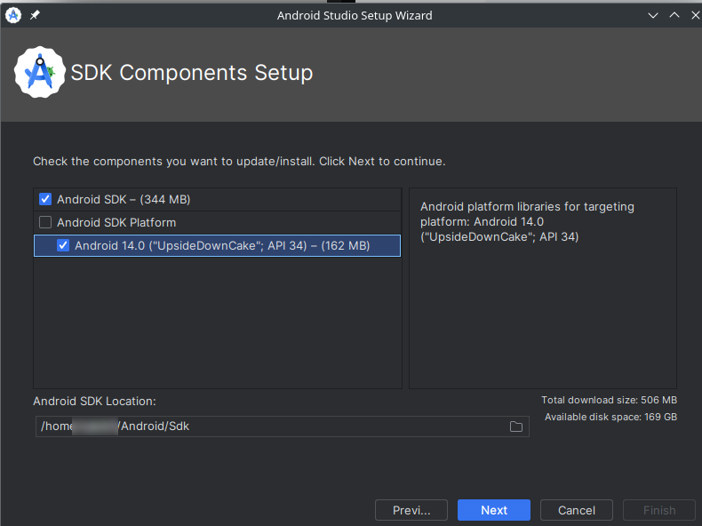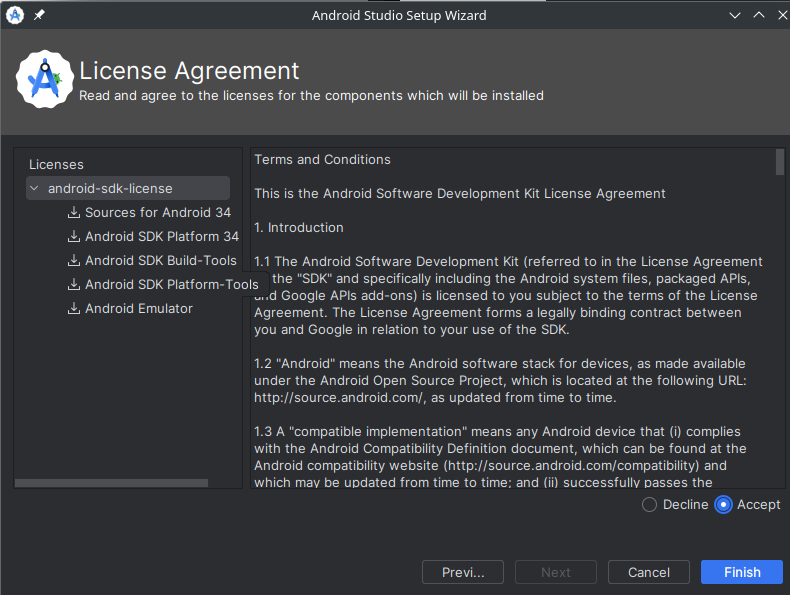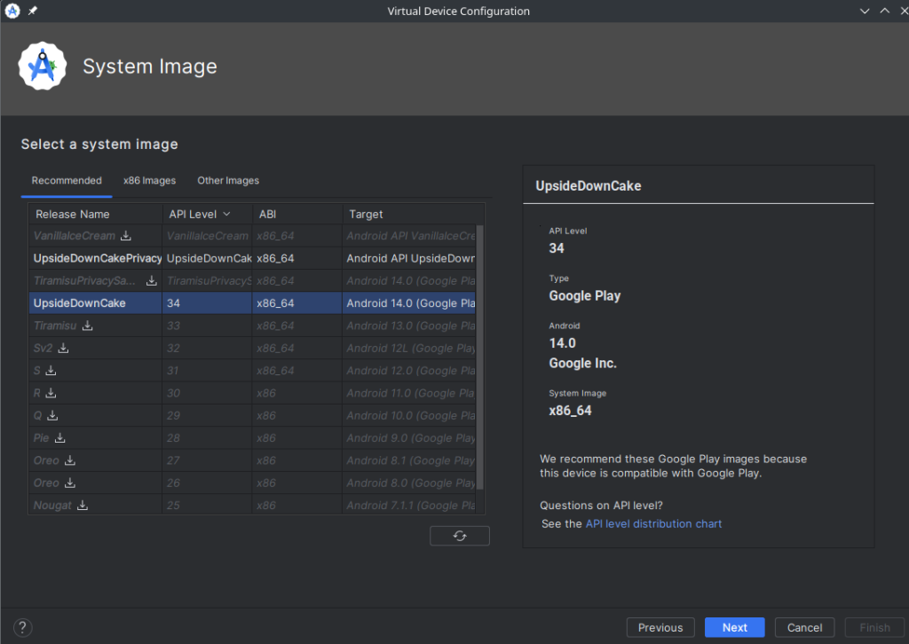 Nesse tutorial, irei seguir com a versão 14, UpsideDownCake. Como essa versão ainda não foi baixada, clique no ícone de download ao lado do nome,aceite os termos de licença e aguarde o término do processo.