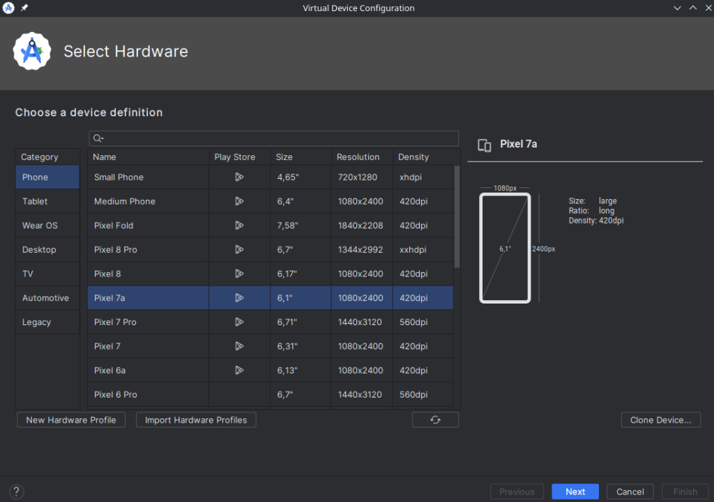 Na próxima tela, escolha o emulador que melhor atenda as suas necessidades, como tamanho, resolução, tipo de dispositivo. Mas escolha um que tenha o Ícone da Play Store na frente.