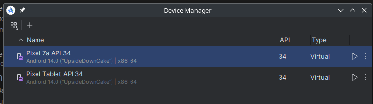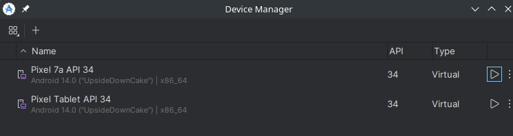 Isso irá trazer uma janela com as máquinas virtuais que você já tem instaladas. Na imagem abaixo, vocês podem ver que eu tenho um emulador de um Celular Pixel e um Tablet Pixel (devido aos tamanhos de tela).