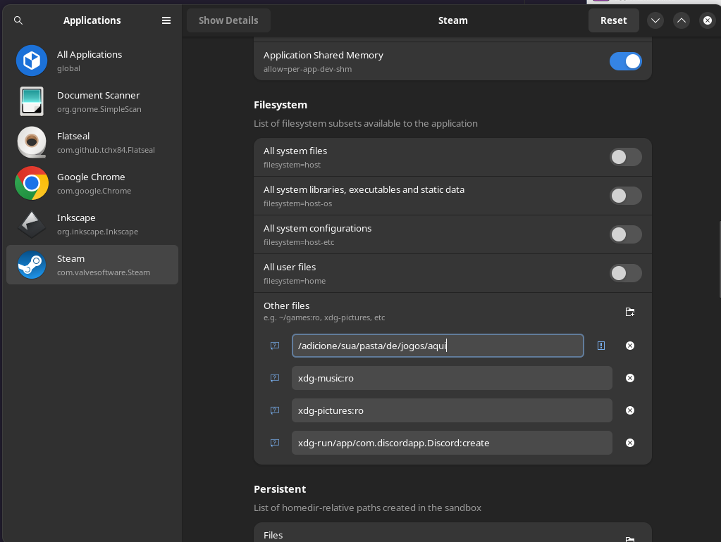 - Instale o Flatseal, via Flathub. Esse aplicativo permite que você utilize uma interface gráfica para realizar as operações.