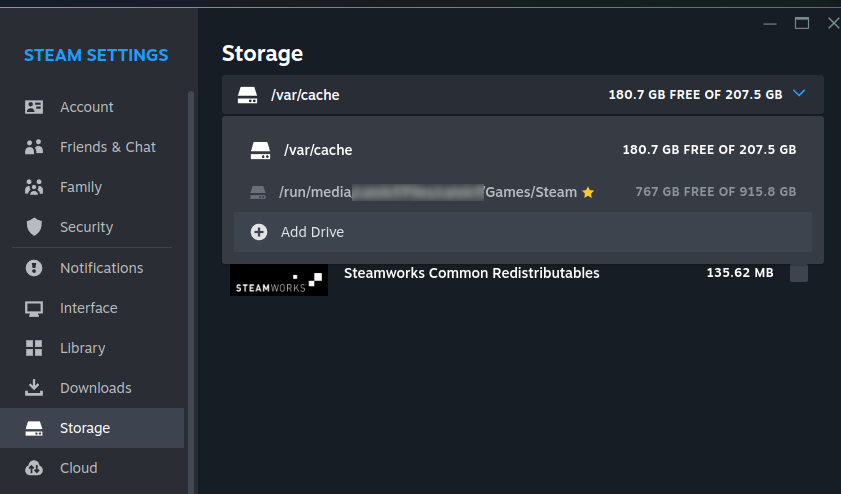 Primeiro de tudo, abra a Steam e adicione a pasta com seus jogos em “Settings->Storage”.